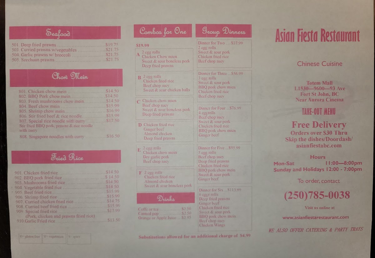 Introducing Asian Fiesta, a hidden culinary gem nestled in the heart of Fort St. John, BC. This vibrant eatery, located at 9600 93 Ave L1530, is a must-visit for anyone craving authentic Asian flavors. Customers rave about the crispy ginger beef and sweet and sour pork, which perfectly balance texture and taste. The almond chicken shines with its crispy coating and rich flavor, making every bite delightful.